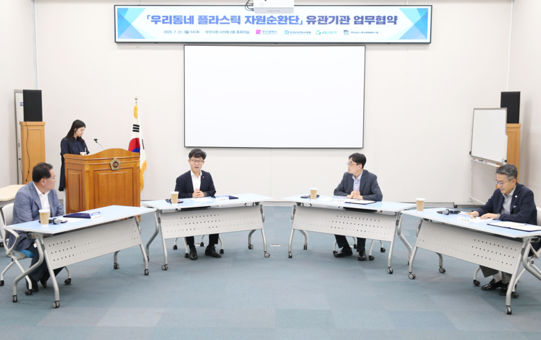 시 사회복지국장, 김양진 한국노인인력개발원 부산울산지역본부장, 박승해 유일산업(주) 대표이사, 김채령 문화공감수정 협동조합 대표이사가 참석해, 「우리동네 플라스틱 자원순환단」의 원활한 운영을 위해 협력하기로 약속했다.