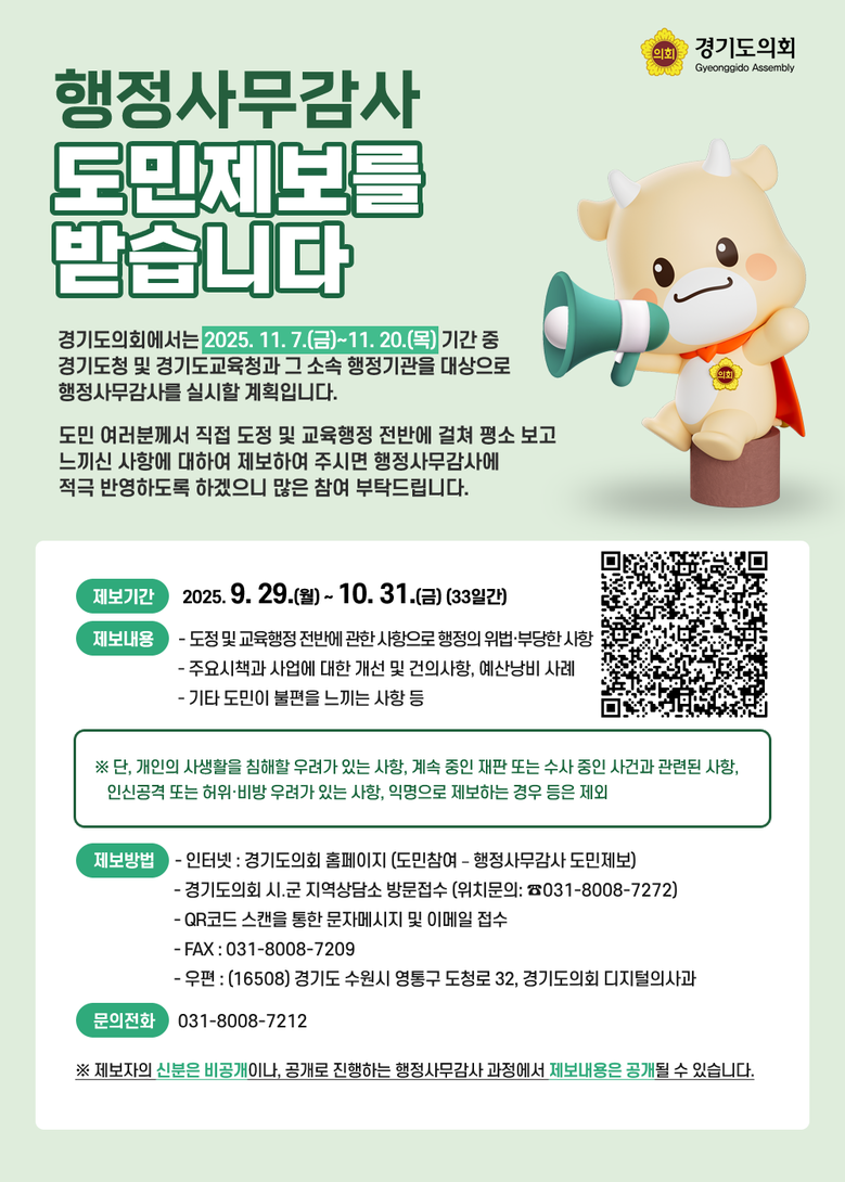 제보 방법은 △경기도의회 홈페이지(도민참여 → 행정사무감사 도민제보) 온라인 접수 △QR코드 스캔을 통한 문자메시지 및 이메일(ggassembly15@gg.go.kr) 접수 △경기도의회 31개 시·군 지역상담소 방문 접수 △팩스(031-8008-7209) △우편(경기도 수원시 영통구 도청로 32, 경기도의회 디지털의사과) 등 다양하다.