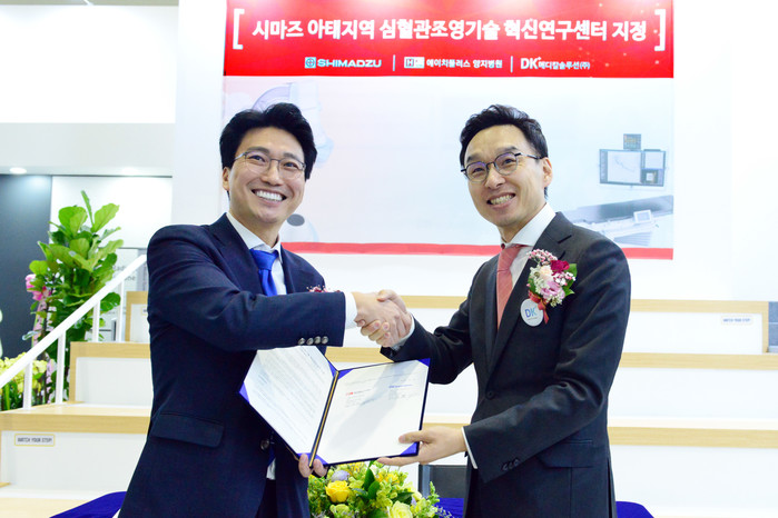 | ▲H+양지병원이 국내 종합병원 최초로 일본의 대표적 의료기기 제조사 시마즈가 주관하는 ‘시마즈 아태지역 심혈관조영기술 혁신연구센터(SIRCAT)‘ 로 지정됐다. H+양지병원과 시마즈 국내협력사 DK메디칼솔루션은 14일 삼성동 코엑스 ‘KIMES 2019’ DK메디칼 전시장에서 혁신연구센터 지정식을 개최했다. 김상일 H+양지병원장(사진 왼쪽)과 이준혁 DK메디칼솔루션㈜ 대표. |