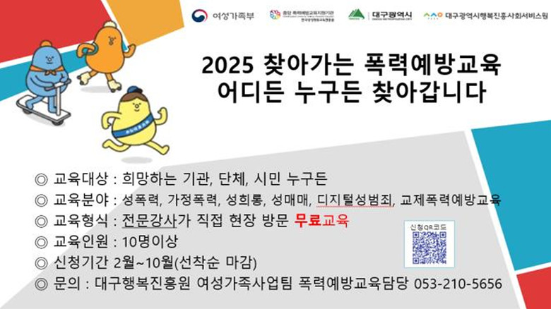 교육을 희망하는 기관은 대구광역시행복진흥사회서비스원(053-210-5656)으로 문의하거나 ‘예방교육통합관리’ 홈페이지(http://shp.mogef.go.kr)를 통해 신청할 수 있다.