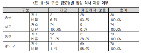 구군별 경로당의 점심제공 여부도 서구, 진구관내 경로당은 100% 점심제공이 되는 반면 전혀 제공되지 않는 구군등 많은 차이가 나고 있다고 지적했다. 점심은 시가 지원하는 양곡과 운영비 및 십시일반 회비를 기반으로 준비되고 있으나, 주로 준비할 사람이 없어 추진되지 못하는 곳이 많은 실정이라고 밝혔다(표III-6 참조).