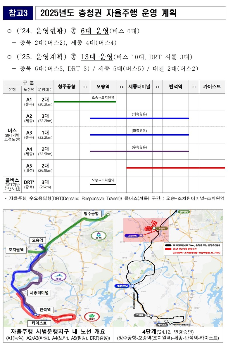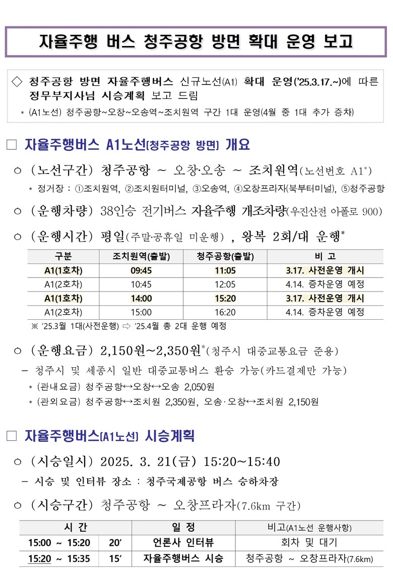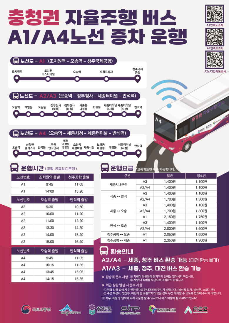 이번에 확대되는 A1 노선은 충청권 자율주행 노선으로 조치원역을 출발해 오송역~오창프라자~청주국제공항까지 운행한다. 우선적으로 3월에 자율주행버스 1대를 사전 운행하고, 4월부터 본격적으로 1일 2대, 왕복 4회 운행한다.