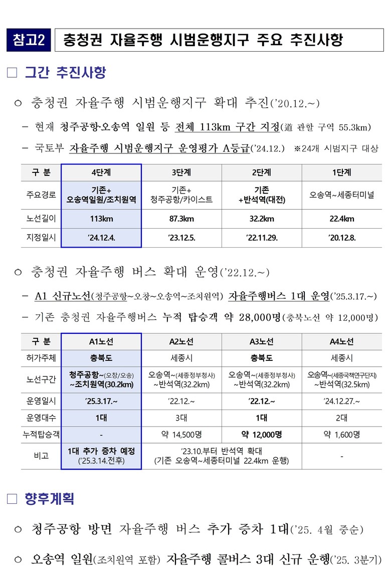 그동안 충북도는 충청권 자율주행 시범운행지구 운영을 하며 오송역~세종~반석역(대전) 노선을 운영해 왔으나, 이번 A1노선을 통해 청주국제공항까지 접근성을 높이고 올해 하반기 중 자율주행 콜버스도 추진할 예정이다. 자율주행 콜버스는 이용자의 요청에 따라 실시간으로 최적 경로를 운행하는 서비스로, 오송역 일대의 교통 편의성 향상에 크게 기여할 것으로 기대된다.