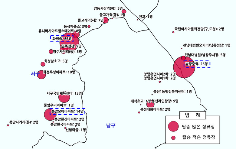 이를 위해 광주시는 지난 4월 한 달간 시내버스 장애인 탑승객 현황 데이터에서 장애인이 자주 이용하는 일반버스 상위 노선과 버스번호를 추출했다. 장애인 탑승데이터와 차량번호별 저상버스 여부를 매칭해 시간대별, 정류장별 장애인 탑승객을 분석하고, 이를 시각화한 것이다.