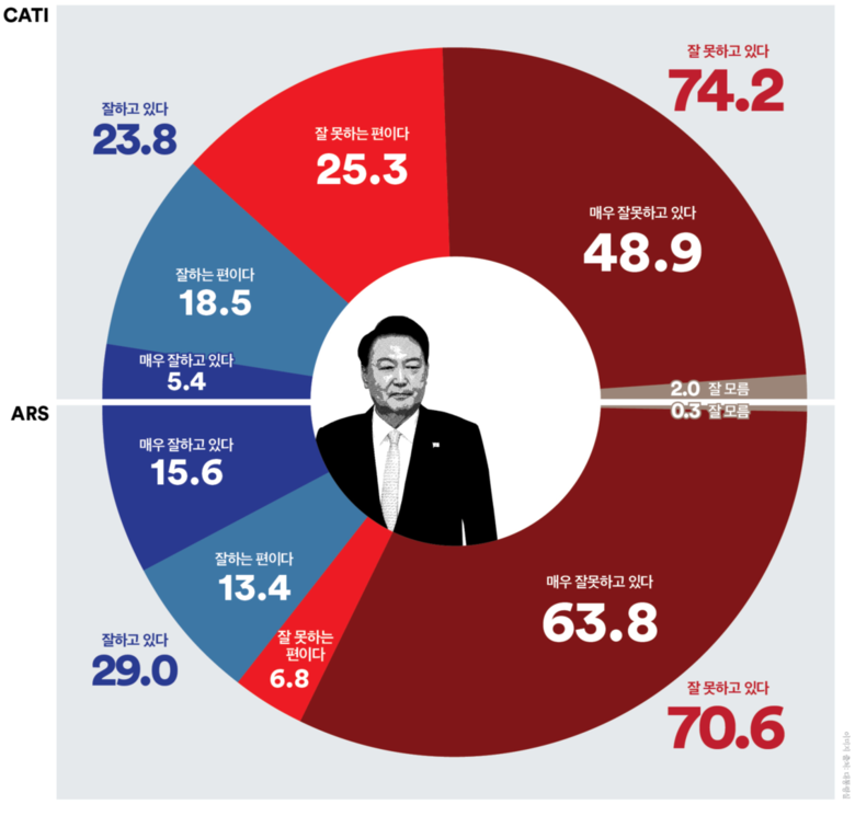 같은 시기에 진행한 ARS조사 결과 ‘긍정’평가는 1.0%p 하락한 29.0%, ‘부정’평가는 1.2%p 상승한 70.6%로 집계되어 41.6%p의 격차를 보였다. 서울과 대구·경북에서 소폭 상승했지만 지난 조사에 이어 모든 지역의 ‘부정’평가 우세가 유지되었다. 연령별로 보면 30대(6.0%p↑), 60대(3.7%p↑)에서 ‘긍정’평가가 상승했지만 70세 이상에서 ‘긍정’ 3.7%p 하락, ‘부정’ 5.0%p 상승하며 모든 연령층이 ‘부정’평가 우세로 바뀌었다. 중도층은 ‘긍정’평가 1.6%p 하락, ‘부정’평가는 1.4%p 상승하며 ‘긍정’평가 26.2%, ‘부정’평가 73.6%를 기록했다(격차 47.4%p).