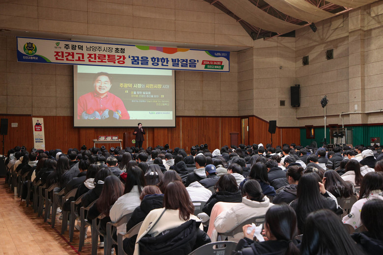 [남양주시 세계타임즈=송민수 기자] 진건고등학교(교장 주영길)는 2024년 12월 24일(화) 2학년 377명 학생을 대상으로 주광덕 남양주시장의 진로 특강 프로그램을 운영하였다.