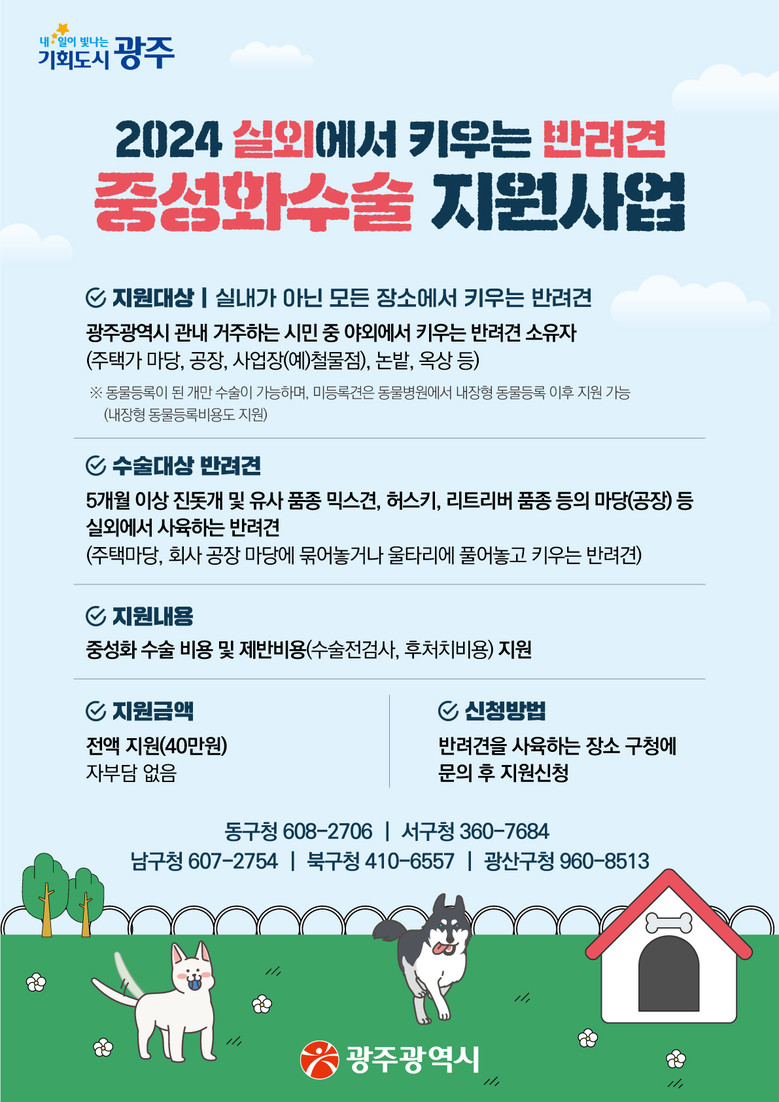 지원 대상은 광주광역시에 주소지를 두고 실거주하고 있는 실외사육견 소유자다. 동물등록을 해야 중성화 수술을 지원받을 수 있으며, 미등록 동물은 등록과 사전검사를 진행한 후 중성화 수술을 하게 된다.