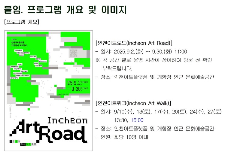 또한, 전시 관람 외에도 시민이 직접 참여할 수 있는 프로그램으로 ‘시민 참여 이벤트’가 9월 2일부터 30일까지 상시 진행된다. 관람객은 ‘인천아트로드 맵’에 표시된 문화예술공간을 방문해 스티커를 수집하면, 인천아트플랫폼에서 제작한 기념품을 받을 수 있다.