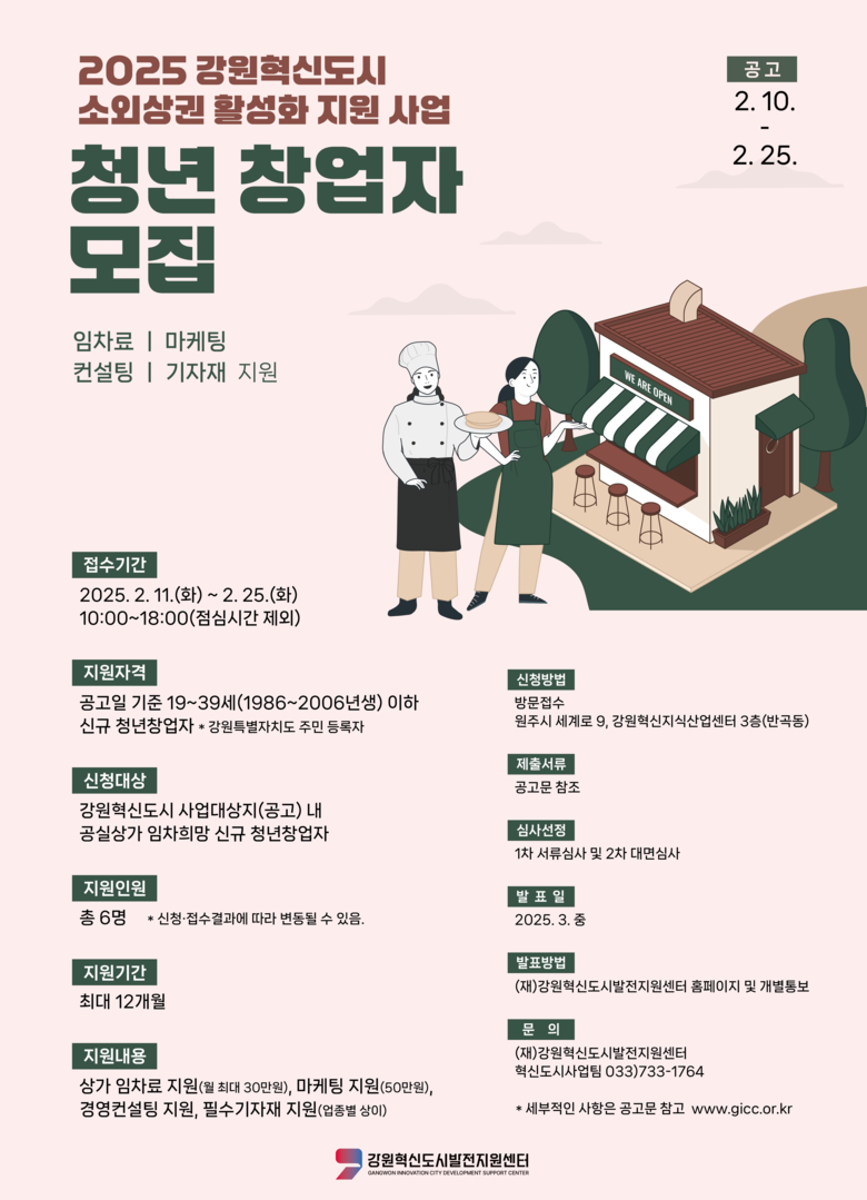 - 2월 11일(화)부터 사업 공고 및 참여자 모집 - [강원도 세계타임즈=김민석 기자] (재)강원혁신도시발전지원센터(센터장 이달환)는 강원혁신도시 내 소외된 상권을 활성화하고, 심각한 공실 문제를 해결하기 위해 예비 청년창업자를 대상으로 임차료 지원 사업을 새롭게 추진한다.