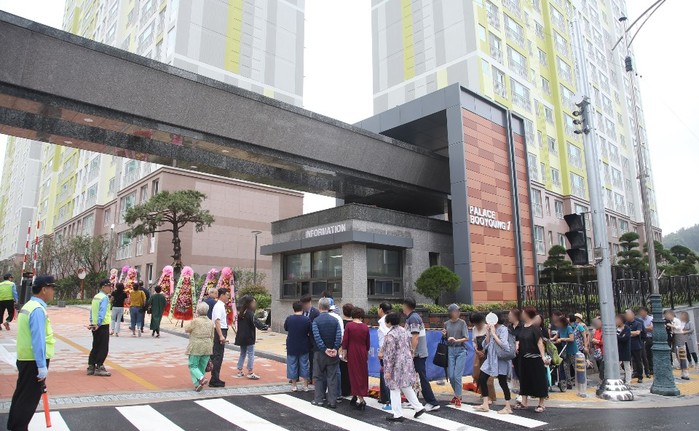 경산 사동 팰리스 부영 1단지는 지하 1층, 지상 16~18층, 9개 동, 전용면적 66m2 198세대, 84m2 432세대로 총 630세대 규모다. 공급 가격은 전용면적 66m2가 1억4900만원부터 1억9300만원까지, 전용면적 84m2가 1억9100만원부터 2억5200만원까지로 책정됐다.