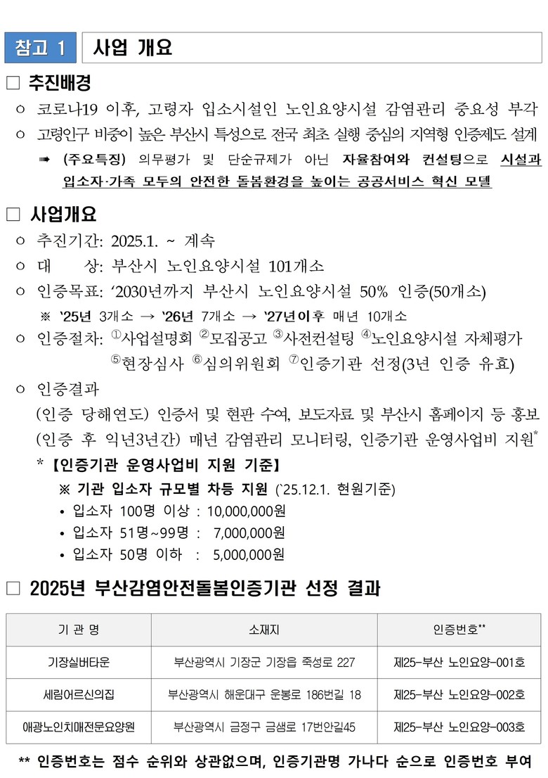 올해 부산감염안전돌봄인증기관은 ▲기장실버타운(기장군) ▲세림어르신의집(해운대구) ▲애광노인치매전문요양원(금정구)*이다. * 기관명 가나다 순