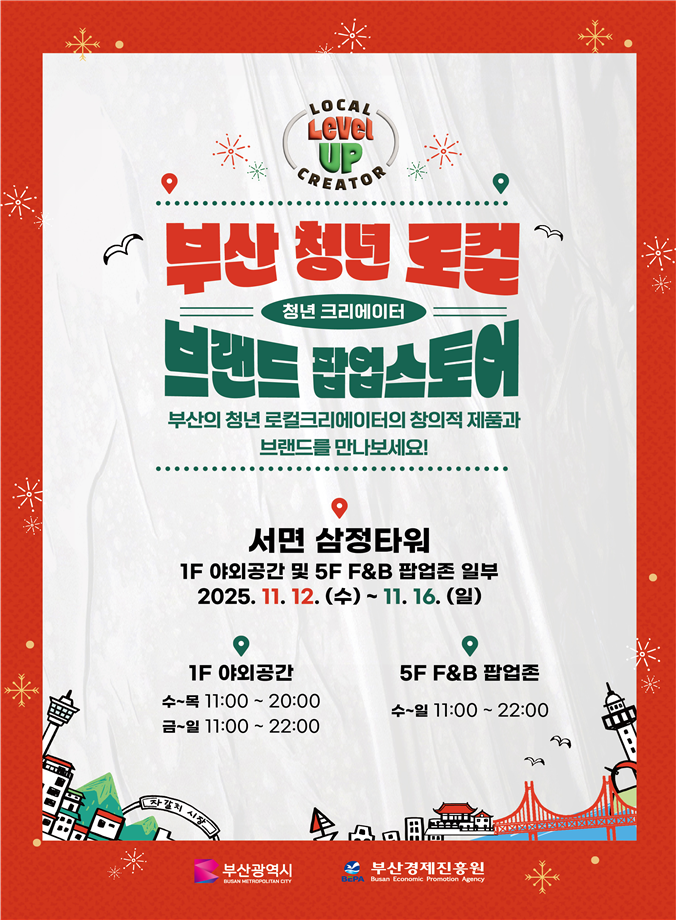 [부산 세계타임즈=이용우 기자] 부산시(시장 박형준)와 부산경제진흥원(원장 송복철)은 오늘(12일)부터 16일까지 5일간 서면 삼정타워에서 '2025 부산 청년 로컬 브랜드 팝업스토어'를 개최한다고 밝혔다.