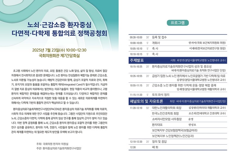 국회의원 한지아 의원실 주최, 한국보건의료연구원 환자중심의료기술최적화연구사업단 주관으로 열리는 이번 공청회는 노인 환자의 건강한 노화, 삶의 질 향상, 의료비 절감을 위해 기존 질병중심 의료에서 환자중심 통합관리로의 전환 필요성을 조망하는 시간을 가졌다.