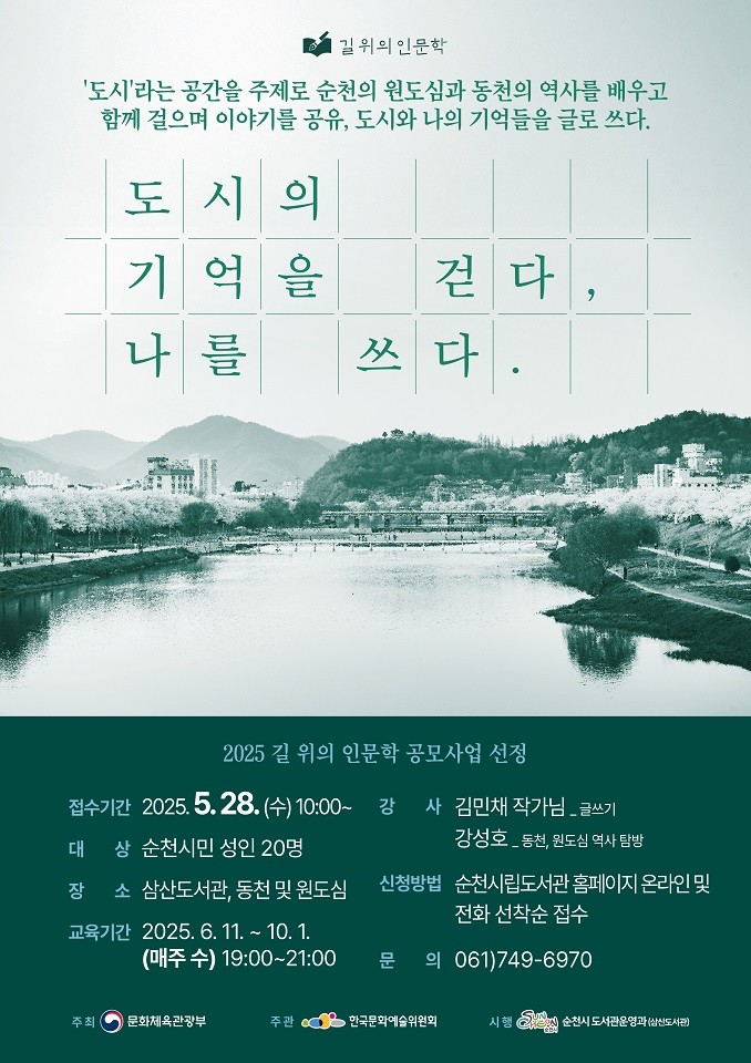 총 17회차로 구성된 이번 프로그램은 2025년 6월 11일부터 10월 1일까지 매주 수요일 저녁 7시부터 9시까지 삼산도서관에서 진행되며, 성인 순천시민 20명을 대상으로 한다.