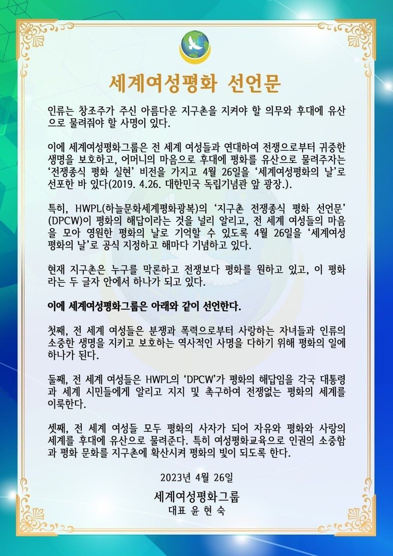 윤 대표는 기념사에서 “4월 26일 ‘세계여성평화의 날’은 민족과 국가, 인종과 종교를 초월해 여성들의 힘을 결속하는 날이 되어왔다”면서 “우리가 추구하는 평화는 일시적이고 표면적인 것이 아니라 다시는 무너지지 않을 지속적이고 본질적이 평화”라고 강조했다.