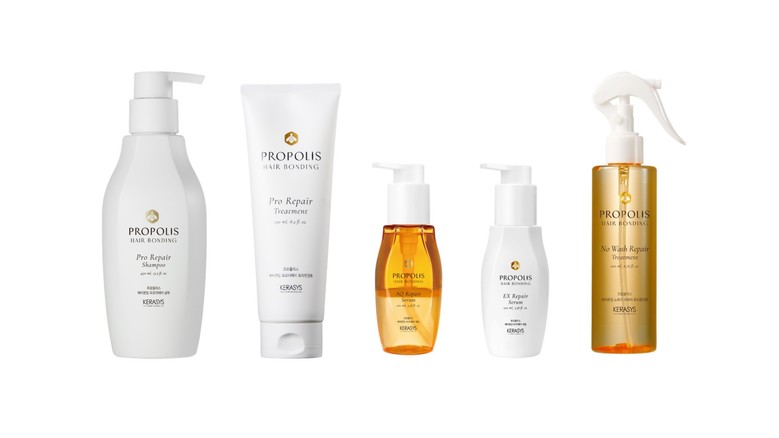 케라시스 프로폴리스 헤어본딩 라인은 사용 단계에 맞게 △밀착감 있는 제형으로 영양 공급과 함께 풍성한 거품으로 부드러운 클렌징이 가능한 ‘프로 리페어 샴푸’ △벌어진 큐티클 틈 사이에 적용해 모발을 매끄럽고 부드럽게 관리해 주는 ‘프로 리페어 트리트먼트’ △오일과 세럼의 두 가지 제형으로 보습과 영양을 동시에 공급해 주는 ‘AQ 리페어 세럼’ △고농축 오일 제형으로 모발 코팅 및 윤기를 제공해 주는 ‘EX 리페어 세럼’ △미세한 앰플 입자가 적용된 스프레이 타입으로 헹굼 없이 끈적이지 않는 영양을 공급해 주는 ‘노워시 리페어 트리트먼트’ 등 총 5종으로 구성됐다.