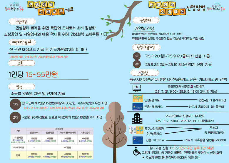 지급대상은 2025년 6월 18일 기준 국내 거주하는 모든 국민이며 비수도권 및 농어촌 인구감소지역에 해당하지 않는 동구의 경우 일반 구민은 15만원, 차상위계층·한부모가정은 30만원, 기초생활수급자는 40만원을 지급받게 된다.