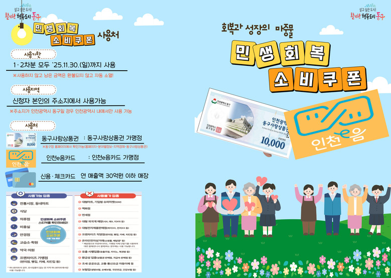 소비쿠폰 사용기한은 11월 30일로 가계 소비 진작을 위해 동구사랑상품권은 11월 30일까지 사용이 권장되지만, 신용·체크카드와 e음카드의 경우에는 사용하지 못한 잔액은 소멸돼 주의가 필요하다.