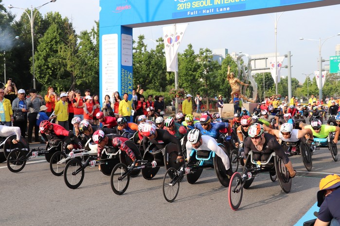 | ▲제27회 서울국제휠체어마라톤대회 풀 코스 마라톤 선수들이 출발하고 있다. |