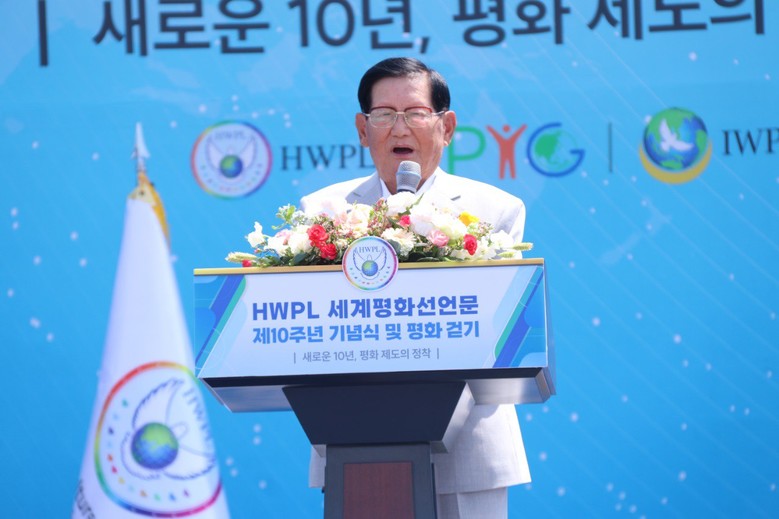 HWPL 이만희 대표는 “10년 전 이 자리에서 세계 평화를 외쳤다. 그리고 지구촌을 31바퀴 돌면서 평화 운동을 했다. 목적은 오직 평화였다. 어떤 단체도 모두 평화를 필요로 했다. 평화를 마다하는 사람은 없었다. 평화는 꼭 이뤄질 것이다. 지구촌에는 많은 단체가 있다. 모든 단체는 평화를 추구해야 한다. 온 세계가 평화로 통일돼야 한다고 본다. 저는 직접 625 전쟁에 참전해 싸웠다. 동족상잔의 비극이었다. 우리가 왜 동족끼리 싸워야 하는가. 이제 우리나라는 통일을 할 때가 됐다. 한 민족이 왜 싸워야 하는가? 전쟁을 좋아하는 사람은 없다. 나라를 다스리는 지도자라면 국민의 뜻에 입각해 통일을 위해 노력해야 한다. 우리나라는 어떤 나라보다도 이 통일이 제일 시급하다고 생각한다. 국민을 무시하고 나라를 무시하고 전쟁을 원해서는 안된다"고 호소했다.