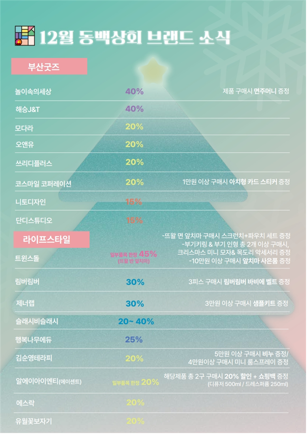 ◈ 시, 「동백상회」가 단순한 판매 공간을 넘어 지역기업의 브랜드와 경쟁력을 키워가는 플랫폼으로 자리매김할 수 있도록 적극 지원할 계획 [부산 세계타임즈=이용우 기자] 부산시(시장 박형준)와 부산경제진흥원(원장 송복철)은 부산 우수 제품 쇼핑 숍 「동백상회」에서 12월 31일까지 송년 감사 특별 할인 행사를 개최한다고 밝혔다.
