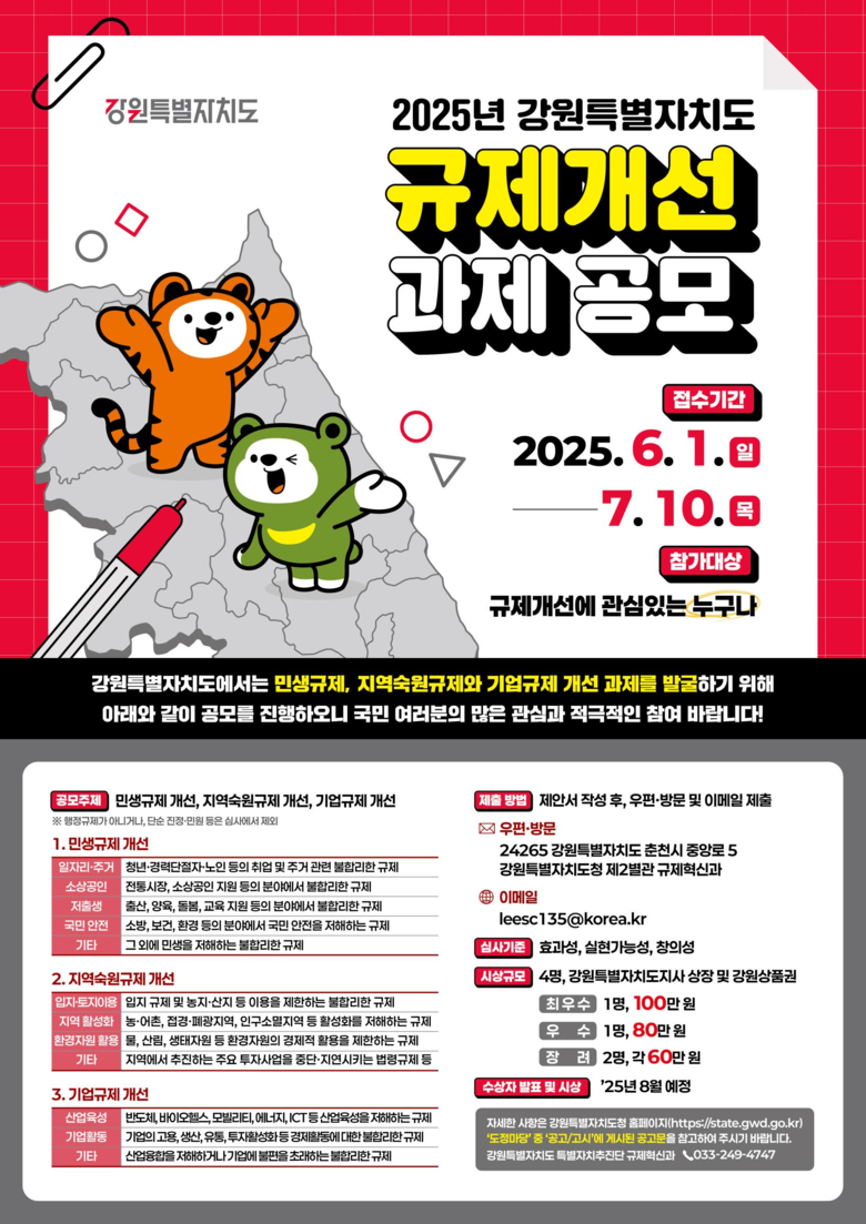 공모 주제는 민생규제, 지역 숙원규제, 기업규제 개선 등이며, 강원특별자치도 누리집에 게시된 제안서 양식을 작성해 이메일, 우편 또는 방문 접수를 통해 참여할 수 있다.