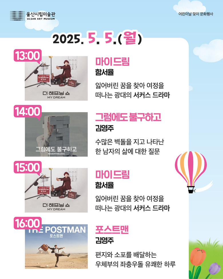 5월 5일(월) 오후 1시에는 ‘마이 드림’, 오후 2시 ‘그럼에도 불구하고’, 오후 3시 ‘마이 드림’, 오후 4시 ‘포스트맨’ 등 총 4회 운영된다.
