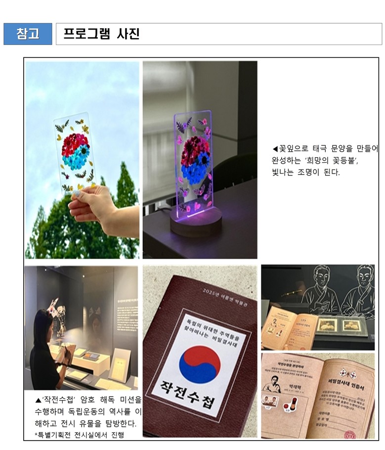 ◈ 여름방학 초등학생 대상 프로그램으로 ▲전시실 투어 ▲암호 해독 미션 ▲희망의 꽃등불 만들기 등 다양한 체험 프로그램 진행