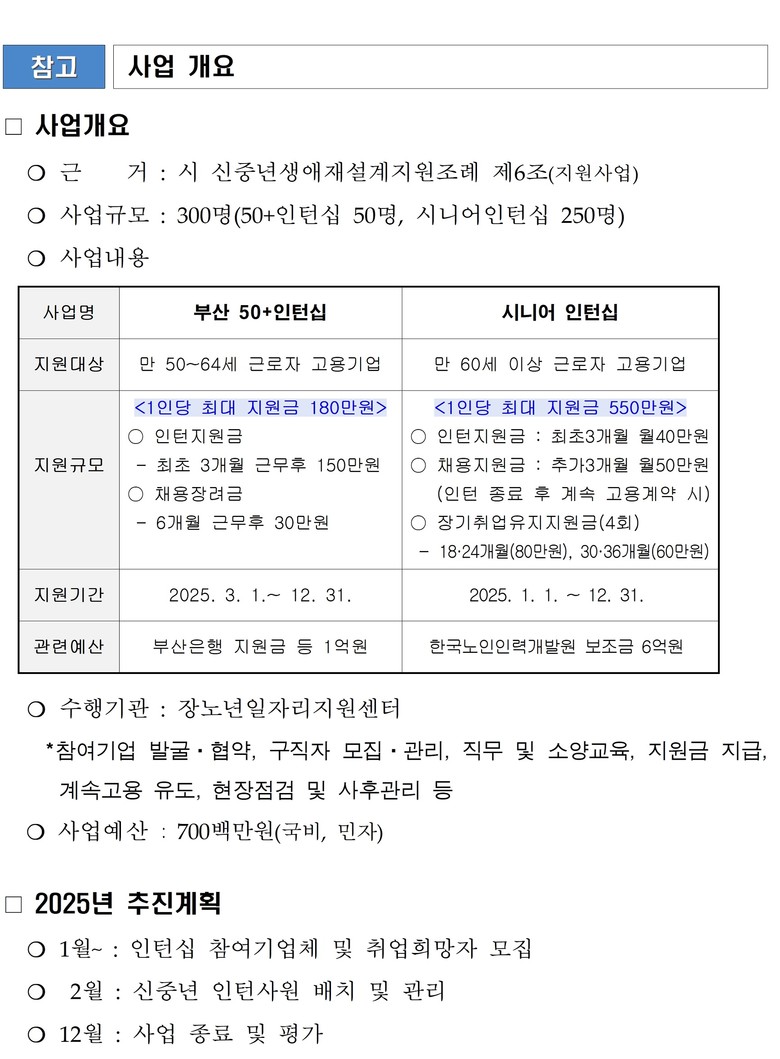 신중년 인턴십 사업은 올해 총 7억 원의 예산(국비 6억 원, 부산은행 지원금 1억 원)으로 추진되며, '부산 50플러스(+)인턴십'과 '시니어인턴십'으로 운영된다.