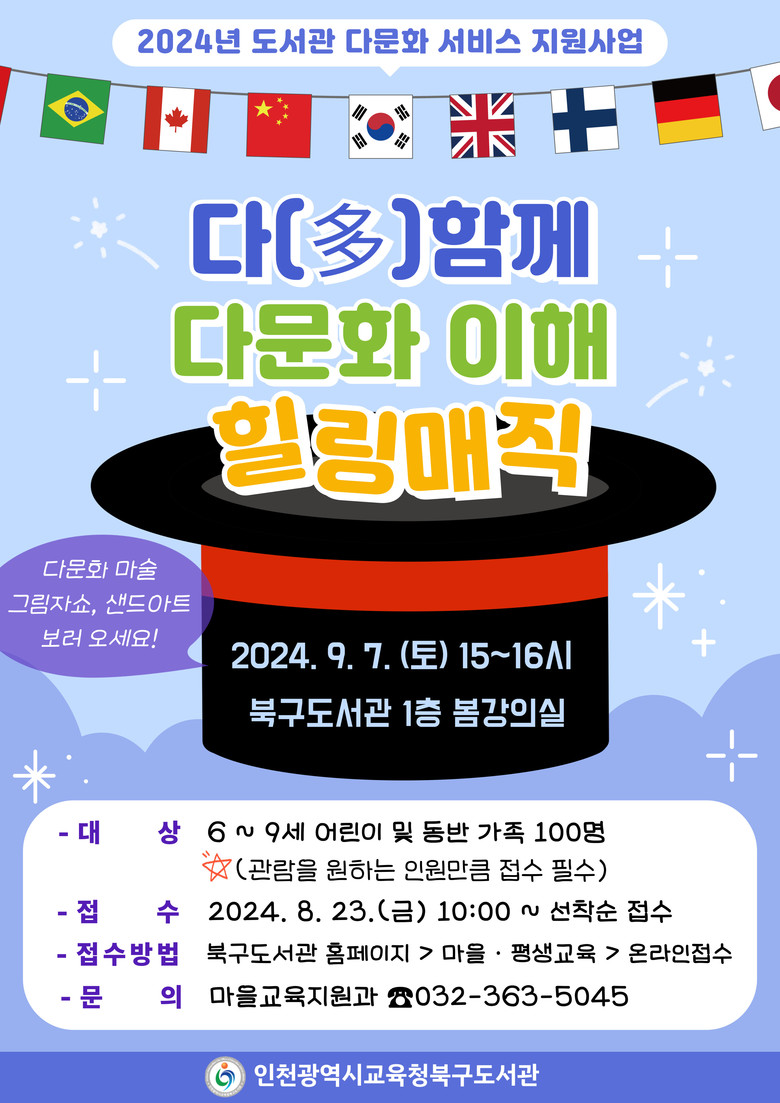 이번 공연은 다름에 대해 이해할 수 있는 가족 참여형 마술 공연으로, 북구도서관 1층 봄 강의실에서 9월 7일 토요일 오후 3시부터 4시까지 운영한다.
