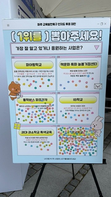 특히 파주시 교육발전특구의 표어인 ‘지역이 키운 인재, 인재가 키우는 파주’를 주제로 한 홍보 공간에서는 특구사업 전반을 설명하는 홍보자료·영상과 함께 초성 맞히기, 인지도 투표, 기념사진 공간 등 참여형 콘텐츠를 운영해 교육공동체의 이해와 공감대를 크게 넓혔다.