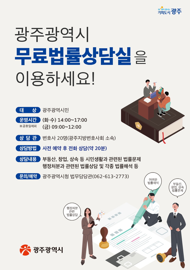 상담을 희망하는 광주시민은 법무담당관실(062-613-2773)로 전화해 예약하면 된다.