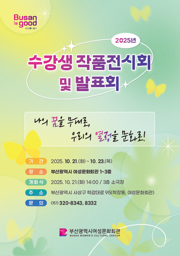 행사는 누구나 참여할 수 있으며, 기타 자세한 사항은 전화(☎ 051-320-8343, 8332)로 문의하거나, 여성문화회관 누리집 공지사항(busan.go.kr/wcc/wcnotice/1701579)을 참고하면 된다.