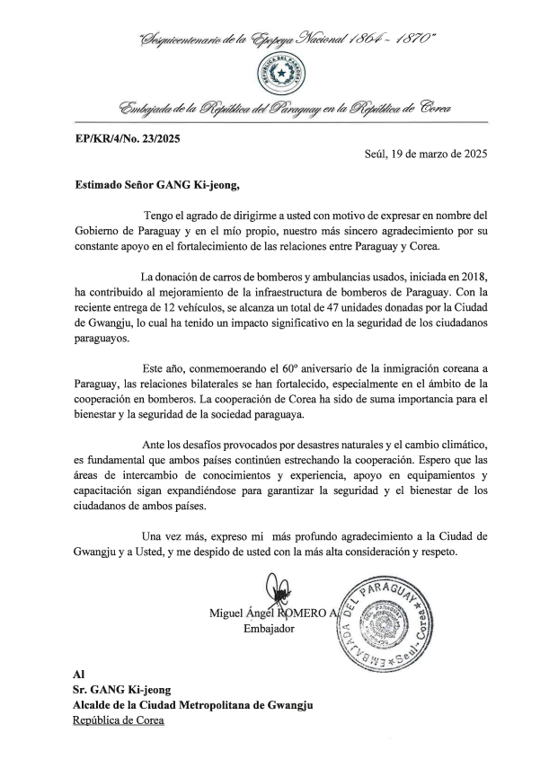로메로 주한 파라과이 대사는 서한문에서 “파라과이 정부를 대표해 파라과이와 한국 간 우호적 관계 증진을 위해 지속적인 관심과 아낌없는 지원을 해주신 시장님께 깊은 감사의 인사를 드린다”며 “광주시의 협력은 파라과이 시민들의 안전을 지키는데 중요한 역할을 하며 양국 간 협력의 중요한 사례로 자리잡고 있다”고 밝혔다.