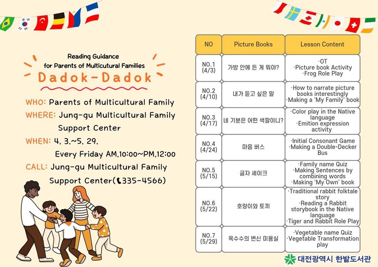 해당 프로그램은 3월 27일까지 중구다문화가족지원센터 방문 또는 전화(☎042-335-4566)로 신청 가능하다. 기타 궁금한 사항은 한밭도서관 자료운영과(☎042-270-7503)로 문의하면 된다.