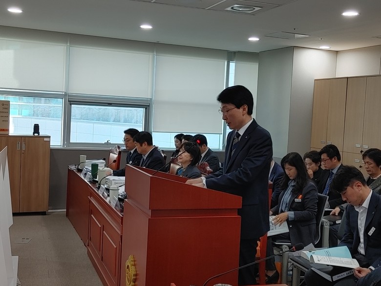 ▲행감 업무보고 발표하는 김민철 경상원장 및 피감 관계자들 모습.