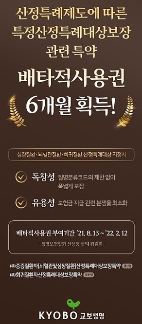 [세계타임즈 이혜원 기자]교보생명은 ‘무배당 특정산정특례대상보장관련특약(갱신형)’에 대해 6개월 배타적사용권을 획득했다고 26일 밝혔다.