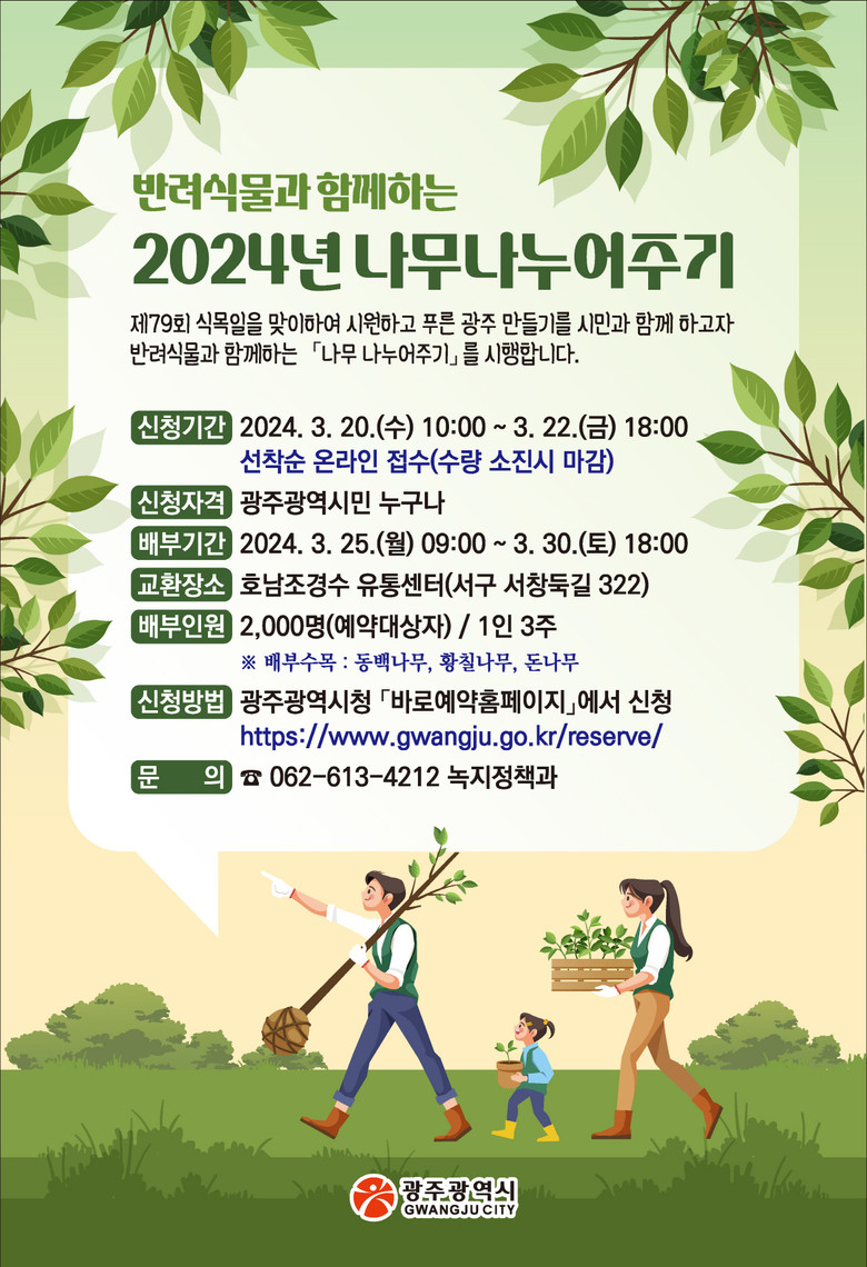 [광주 세계타임즈=손권일 기자] 광주광역시(시장 강기정)는 25일부터 30일까지 ‘반려식물과 함께하는 나무 나누어주기 행사’를 개최한다.
