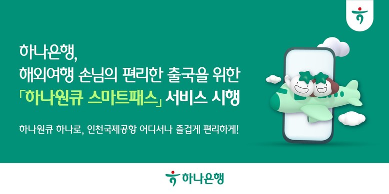 이번 서비스 시행으로 하나은행 대표 모바일 앱 ‘하나원큐’에서 스마트패스 이용이 가능해졌다. 이를 통해 인천국제공항을 이용하는 손님들은 ‘하나원큐’ 앱 하나로 ▲출국절차 간소화(스마트패스) ▲당일수령 외화환전(환전지갑) ▲면세점 제휴 쿠폰(외환혜택라운지) 등 즐겁고 편리한 해외여행 경험과 혜택들을 누리게 될 것으로 기대된다.