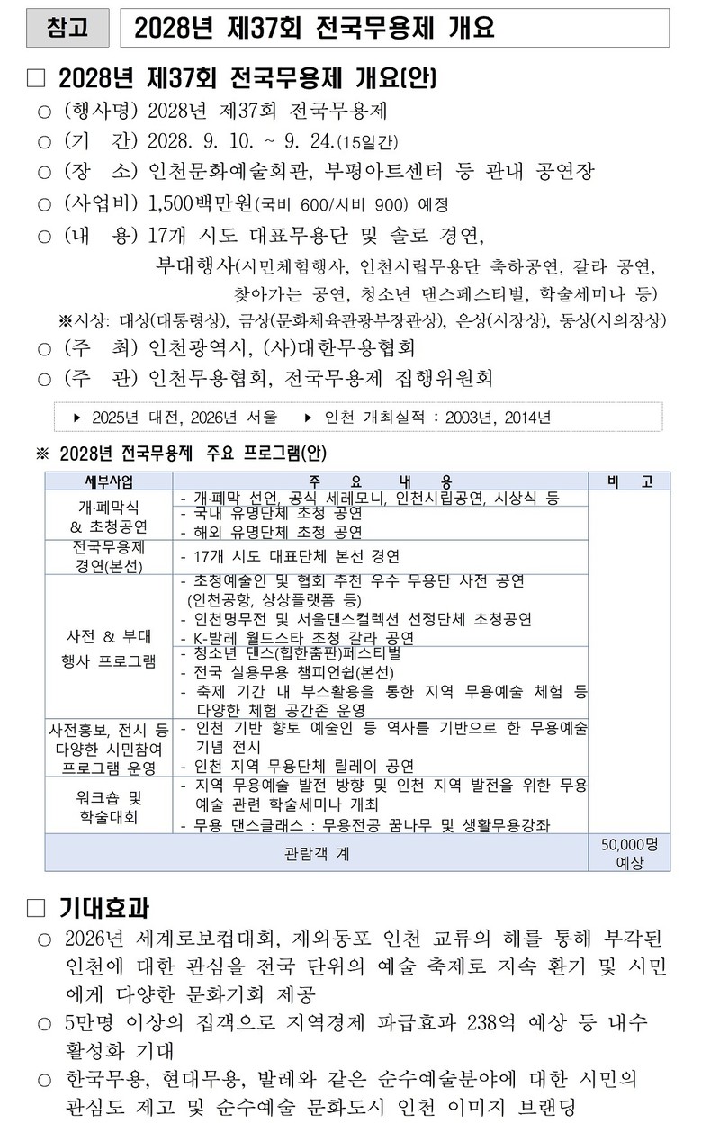 [인천 세계타임즈=심하린 기자] 인천광역시(시장 유정복)가 2028년 ‘제37회 전국무용제’유치에 성공했다. 17개 시·도 대표 무용단이 참여하는 국내 최대 규모의 무용 축제로, 약 5만 명 방문과 238억 원 규모의 경제효과가 기대된다.