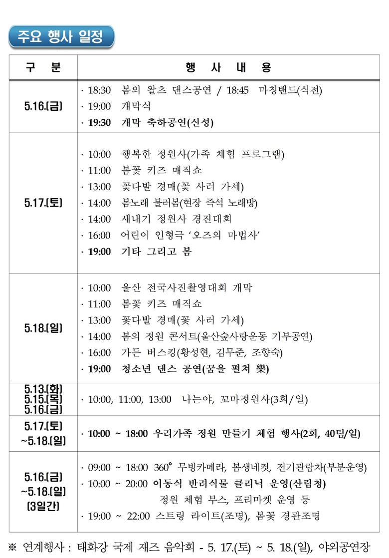 특히 올해에는 태화강 국가정원 봄꽃, 십리대숲을 배경으로 울산 학춤, 발레, 울산의 대표적인 처용탈 제작 시연 등과 함께 (사)한국사진작가협회 도움을 받아 울산 전국사진촬영대회도 개최해 태화강 국가정원을 전국적으로 홍보한다.
