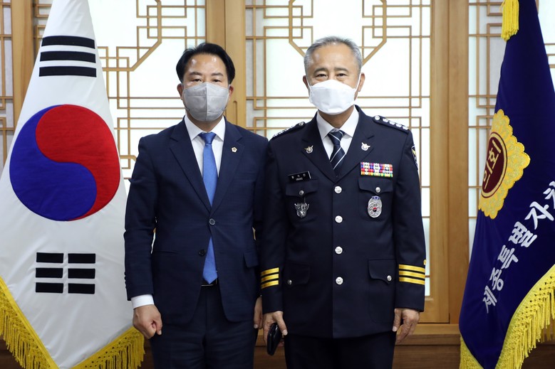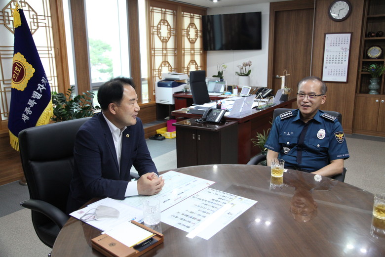 상병헌 의장은 박성갑 세종남부경찰서장과 황석헌 세종북부경찰서장을 각각 만난 자리에서 취임 축하 인사를 건네고 치안 유지를 위한 경찰 공무원들의 노고에 감사의 뜻을 전했다.
