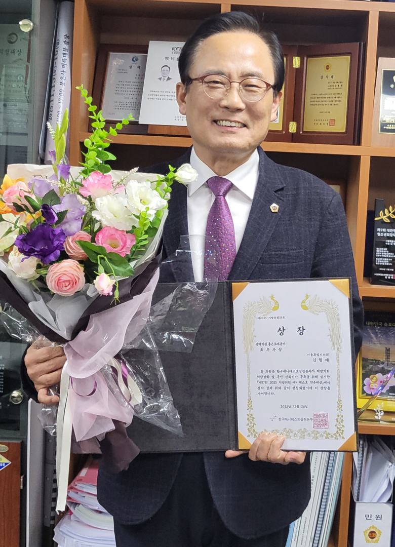 [서울 세계타임즈=이장성 기자] 서울특별시의회 김형재 의원(국민의힘·강남2)이 한국매니페스토실천본부가 주최한 ‘제17회 2025 지방의원 매니페스토 약속대상’에서 좋은 조례 분야 ‘최우수상’을 수상했다.