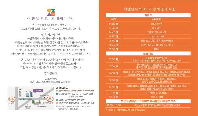 이번 개소 1주년 기념식은 여성가족부 장관, 시의원, 여성단체장, 여성폭력예방 현장 전문가 등 100여 명이 참석한 가운데 ▲축하공연 ▲센터 홍보영상 상영 ▲1주년 성과보고 ▲기념 세리머니 순으로 진행된다.