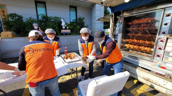 [대전=세계타임즈 이채봉 기자] 9천명 SNS 대전시 봉사단체 사랑의 사다리 밴드(리더 이정제)는 지난 12일 오후 4시, 전남 영암군보건소에서 바비큐 통닭 80마리 봉사로 우리 사회의 따뜻한 사랑을 전달하였다.