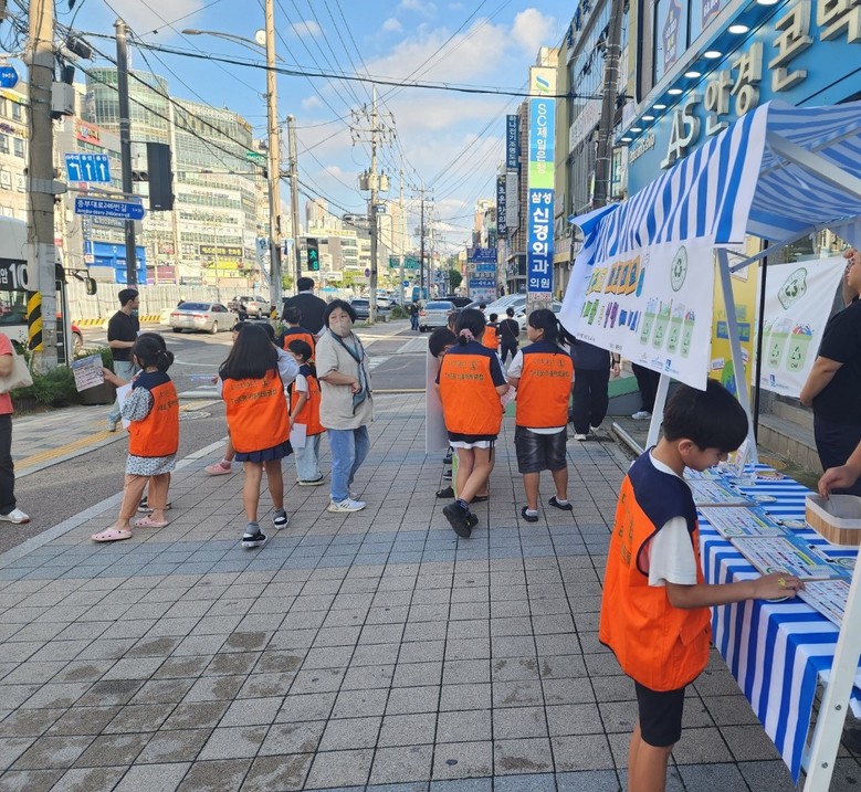 [수원시 세계타임즈=송민수 기자] 지난 18일, 수원시 매탄1동 행정복지센터(동장 김은정)는 The꿈지역아동센터(센터장 설연란) 선생님들과 학생들이 함께 매탄1동 주요 거리에서 지역 주민을 대상으로 “더꿈 에코레인저” 공동 환경 캠페인을 진행했다.