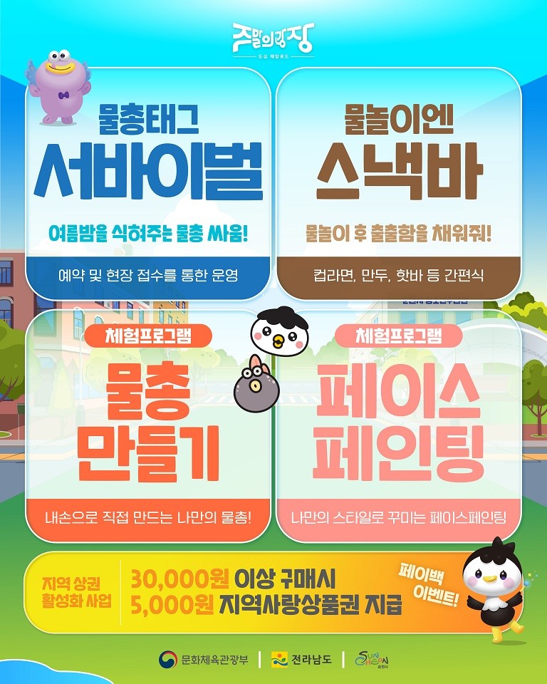 - 잔디로드, 10M 대형 루미 인형 포토존, 물총 서바이벌까지 다양한 프로그램 준비 [순천시 세계타임즈=우덕현 기자] 순천시(시장 노관규)가 오는 15일부터 16일까지 문화의 거리 일원에서 ‘도심 해방로드, 주말의 광장(젊은이들의 해방구)’을 개최한다고 밝혔다.