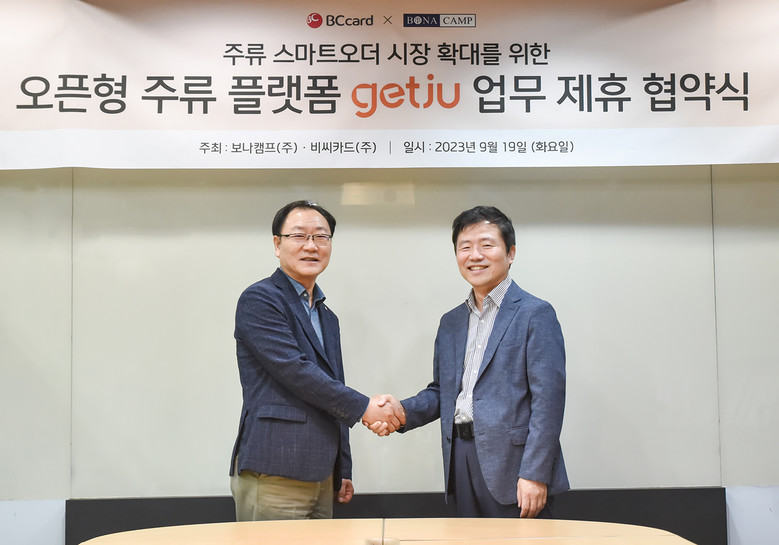[세계타임즈 = 이송원 기자] BC카드(대표이사 사장 최원석)가 주류·푸드 스마트 오더 플랫폼 운영사 ‘보나캠프’와 서비스 활성화를 위한 제휴계약을 체결했다고 20일 밝혔다. 보나캠프가 운영 중인 ‘겟주(getju)’는 전문 주류(와인, 위스키, 전통주 등) 유통 플랫폼이다.