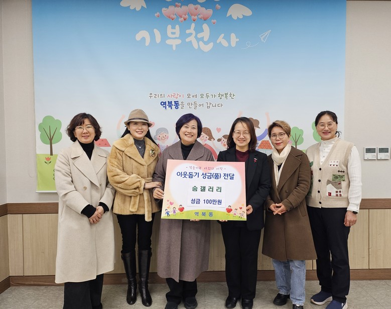 역북동은 13일 숨갤러리(대표 신경옥)가 지난해 12월 16일부터 31일까지 진행한 ‘크리스마스 선물전’의 전시 수익금 100만 원을 기탁했다고 밝혔다.