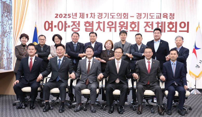 최종현 대표의원과 임태희 교육감, 백현종 국민의힘 대표의원은 이날 도의회 예담채에서 ‘제1차 경기도의회-경기도교육청 여야정협의체 전체회의’를 열고 ‘2026년도 본예산 협치예산 합의문’에 서명했다.